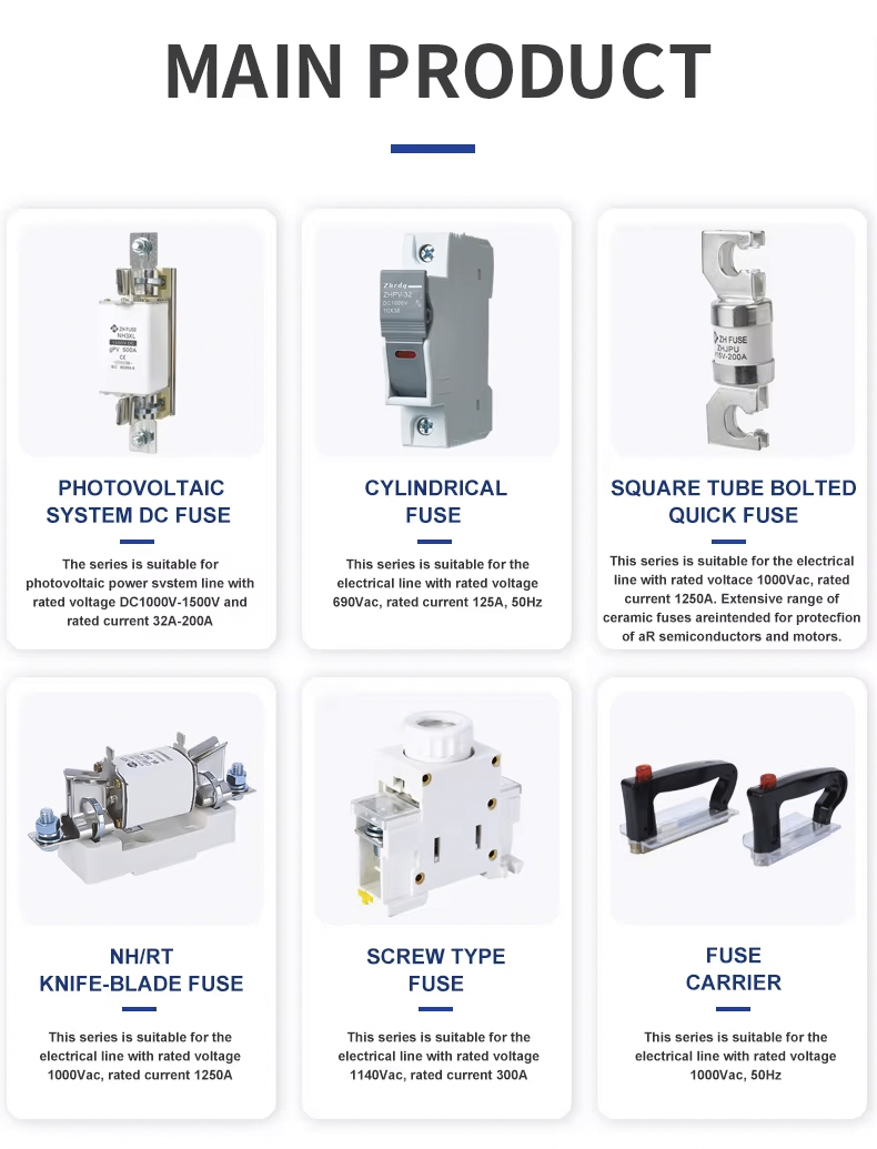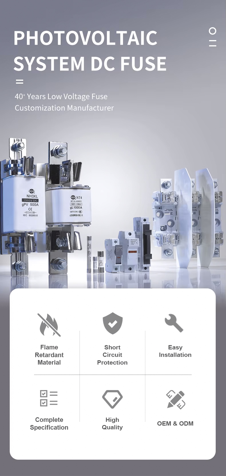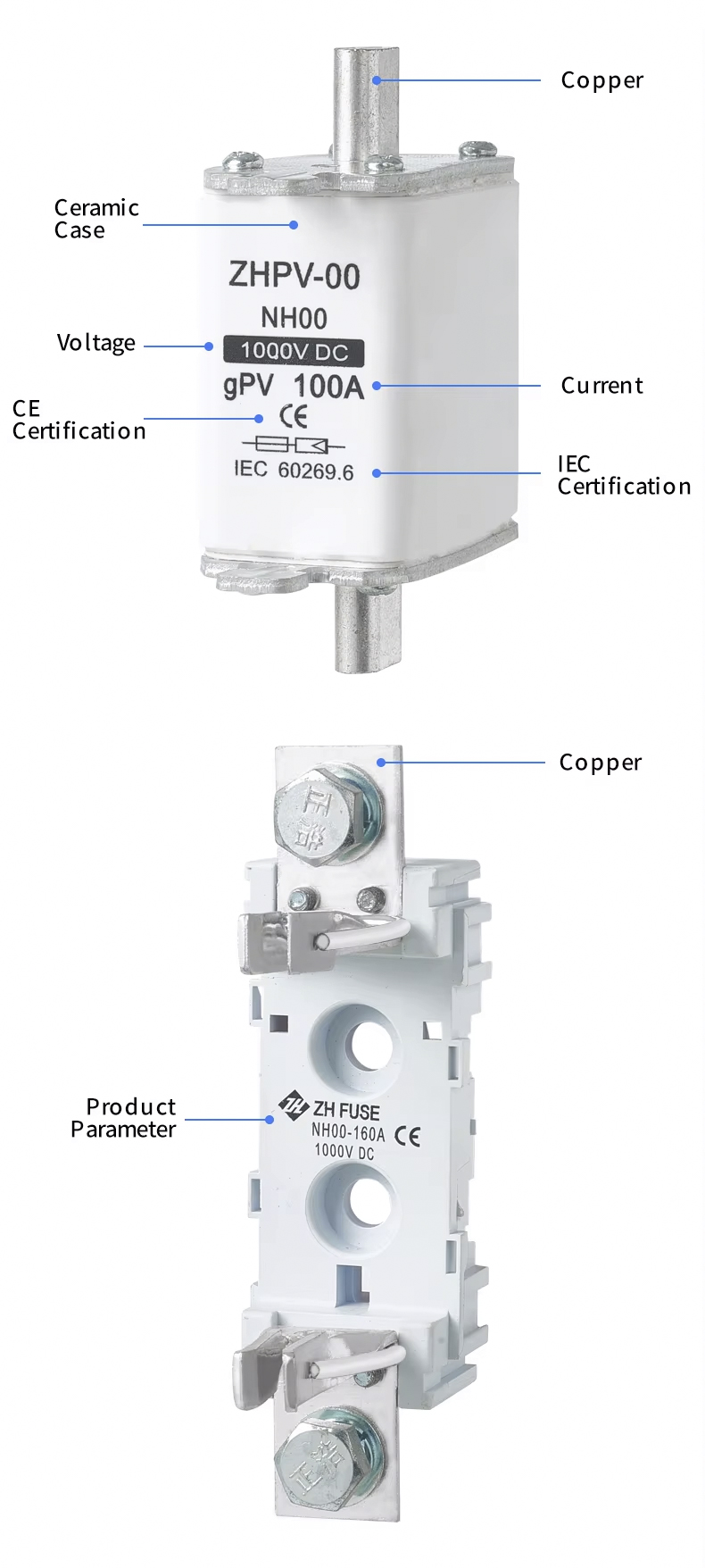 NH00 Sistema Fotovoltaikoa DC 1000V 32 ~ 100A Fuse Link egokia da DC sistema fotovoltaikoetan gehiegizko korronte babesteko. Produktu honek 1000V DC-ko gehienezko tentsioa eta 32 ~ 100A-ko korronte tartea onartzen ditu. Eguzki-zentraletarako eta energia biltegiratzeko sistemetarako bereziki diseinatuta dago, eta gainkargak edo zirkuitu laburrak eragindako ekipoen kalteak eraginkortasunez ekidin ditzake.